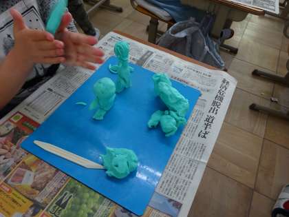 粘土を使って、自分が友達や動物と一緒の散歩をしているところを表現しました。「しっかりと立たせること」これがなかなか難しくて、はじめは何度もつくり直していましたが、こつをつかむと、動物の上の乗っている自分や友達と手を繋いでいる自分、楽しいポ一ズをしている自分などを、工夫しながら本当に散歩をしているようなウキウキした様子でつくっていました。