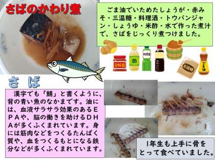さばのかわり煮は、さばをごま油でいためたしょうが・赤みそ・三温糖・料理酒・トウバンジャン・しょうゆ・米酢・水でつくった煮汁でじっくり煮つけました。赤みそやトウバンジャン・酢などを入れるので、しょうが煮とは違ったこくがあります。ごはんによく合い、子どもたちもごはんと一緒においしそうに食べていました。さばの骨はかたいので、食べることは難しいですが、1年生も上手に骨をとって食べていました。