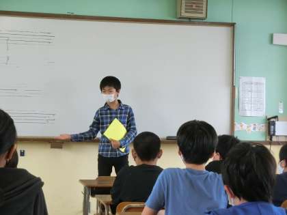 国語科の授業で各クラスで言葉についての提案をした中から,一人が代表となって,提案のスピーチをしました。二人とも堂々とした素敵な提案をしてくれました。「明日から意識したい」という気持ちになった人も多かったと思います。