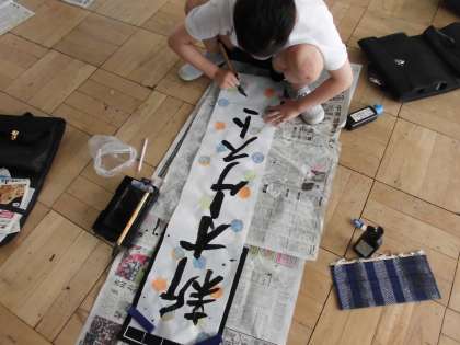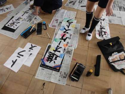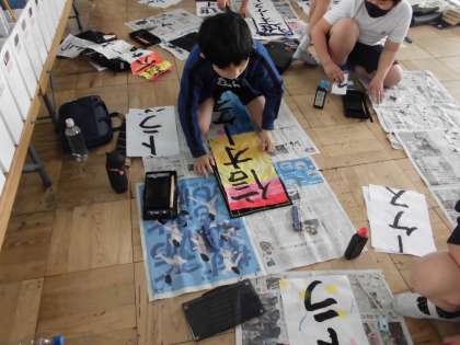 昨日色付けを行った画仙紙に本書きをしました。今回使用した画仙紙はいつもの半紙の3枚分の大きさで大迫力です!!!色付けされた画仙紙に字が加わるととてもカッコ良い完成となりました。授業参観で保護者の方に見て頂くのが楽しみです♪