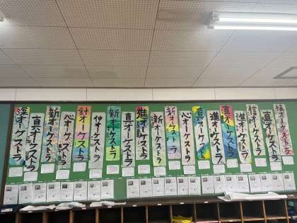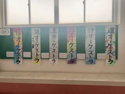 完成した「シン オーケストラ」を掲示しました。画仙紙の下には自分の選んだ「シン」の言葉の理由や想いそして、今年度頑張りたい目標を書いています。想いの込められた字をみると「かっこいいな…これからの成長が楽しみだな…」とワクワクしてきます。