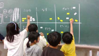 生活科の「ぐんぐんそだて おいしいやさい」の学習では、ミニトマト、ナス、キュウリ、枝豆、オクラ、ピーマンの中から、育てたい野菜を選びました。