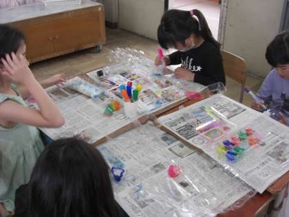 おうちから持ってきた卵パックやペットポトルに色をぬり、光を通しながら映し方を試していきました。