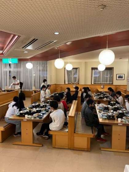 慶野松原荘で入浴、おみやげの買い物が終わると、いよいよ夕食です。おいしい食事に舌鼓を打ち、仲間との楽しい食事時間を過ごします。