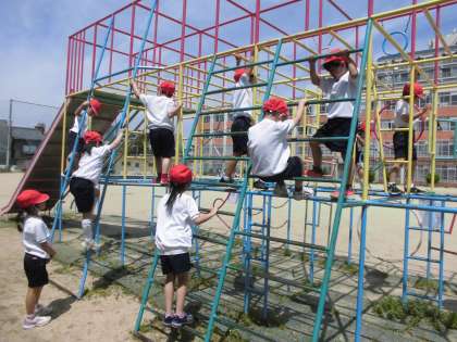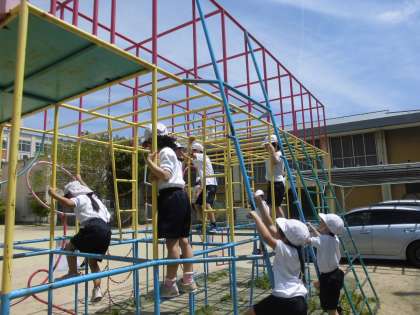 総合遊具の使い方を学習しました。総合遊具では三点持ち(両手と片足)をすることを伝えました。しっかり子ども達は意識しながら取り組んでいました。