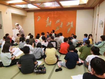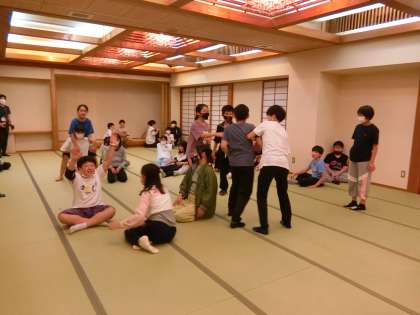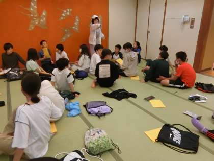 夜に行ったレクレーションとふり返りの様子です。レク係の人たちが司会をし,みんなで楽しいゲームをすることができました。そして,一日をふり返り,成果と課題について班ごとに話し合いました。