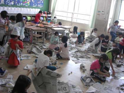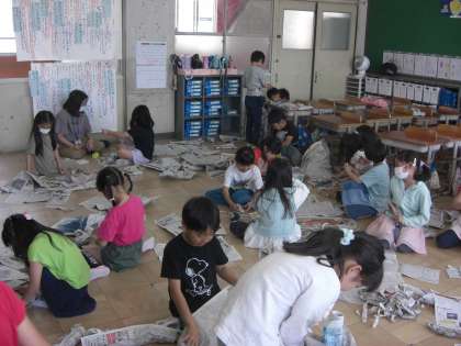 図画工作科の「しんぶんしと なかよし」の学習で、工夫しながら新聞紙を使って様々なものを作りました。丸めたり、ちぎったり、引っ付けたり…。色々な工夫で、楽しい工作ができました。