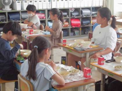 5月の連休明けから 机を向かい合わせにして給食を食べています。「黒板の方を向いて黙食で」よりも、やっぱり楽しいしおいしいと感じているようです。給食時間が今まで以上に楽しい時間になっているようです。