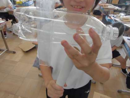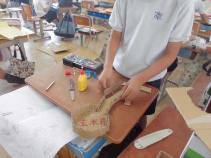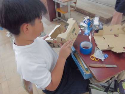 集めた材料を使って作品の制作が始まりました。段ボールカッターや両面テープ、ボンドなどを使って自分がイメージした作品を形にしていきます。ビー玉の転がり具合を確かめたり試したりしながら作っていました。
