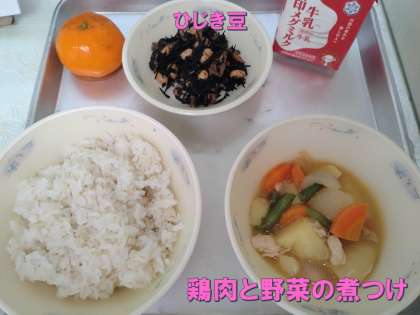 今日の献立は「麦ごはん・牛乳・鶏肉と野菜の煮つけ・ひじき豆・みかん」でした。