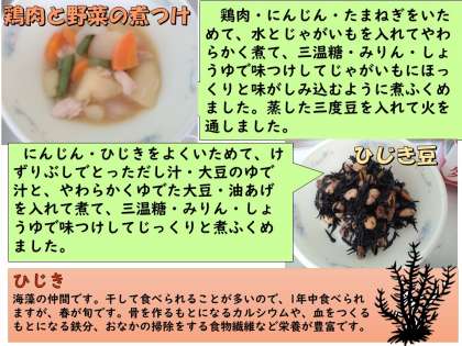 ひじき豆は、ひじきとにんじんをよくいためてから、けずりぶしでとっただし汁・大豆のゆで汁とやわらかくゆでた大豆・油あげを入れて、三温糖・みりん・しょうゆで味つけしてじっくり煮ふくめました。こちらもひじきや大豆に味がしみてごはんがすすみます。子どもたちも、どちらもごはんと食べるとおいしい!と順番に口に入れて口中調味しながら食べていました。
