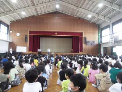 毎月1日は朝会です。今月から1年生も体育館で朝会に参加することになりました。教頭先生の話をしっかり聞くことができていました。