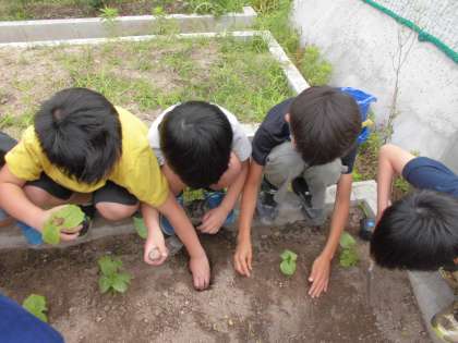5月に種まきをしたツルレイシの苗が大きくなってきました。今日は苗を畑に植えかえました。4年1組の苗は明日畑に植えかえる予定です。