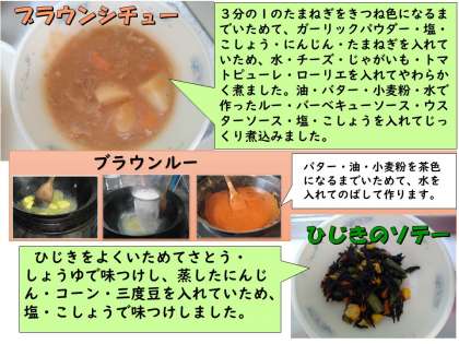 ブラウンシチューは、茶色く色づけたルーを使ったシチューです。豚肉・たまねぎ・にんじん・じゃがいもを入れました。たまねぎは全体の1/3分を最初にきつね色になるまでいためてコクを出します。そのあとに豚肉・にんじん・残りのたまねぎを入れてよくいため、水・チーズ・じゃがいも・トマトピューレ・ローリエを入れてやわらかく煮て、ルー・バーベキューソース・ウスターソース・塩・こしょうを入れてじっくり煮込みました。茶色く色づくまでいためたルーの香ばしさや、たまねぎをよくいためたり、じっくり煮込むことでコクが出ます。パンによく合い、子どもたちにも大人気でした。残ったルーをパンにつけながら食べている子もいました。