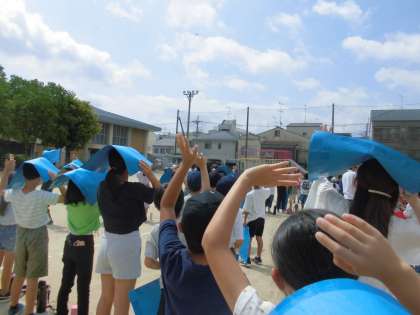 学校創立90周年記念の航空写真撮影をしました。全校で校章をかたどり、飛行機から撮影。次に隊形を変えて校舎の4階から撮影。最後に学年ごとに写真撮影をしました。暑かったですが子ども達にとっては初めての体験できっと良い思い出になるのではないかと思います。