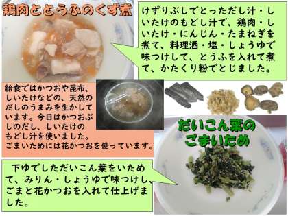 鶏肉ととうふのくず煮は、けずりぶしでとっただし汁としいたけのもどし汁で、鶏肉・しいたけ・にんじん・たまねぎ・とうふを煮てかたくり粉でとじています。味つけは、料理酒・塩・しょうゆでしました。けずりぶしやしいたけ、鶏肉のうまみのきいた煮汁がとうふにからんでごはんによく合います。子どもたちもごはんと一緒においしそうに食べていました。