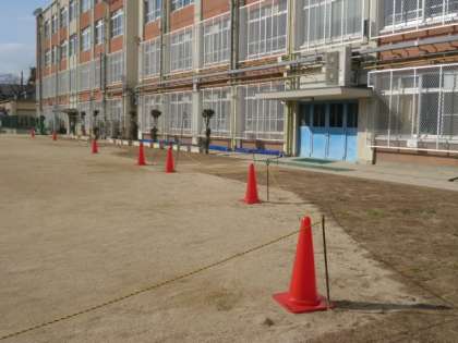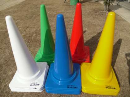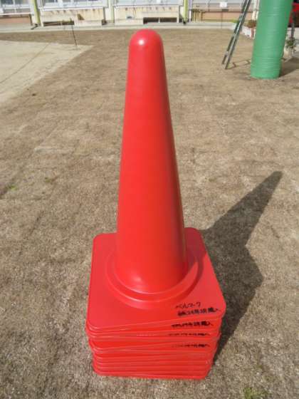 カラーコーンの傷みが激しかったので,今年度のベルマークで購入していただきました。赤のコーン10個,5色組のソフトコーンを4セットです。さっそく赤のコーンを芝生の周りに並べました。