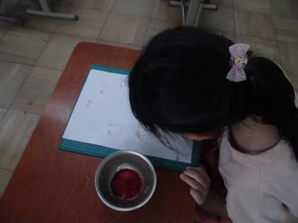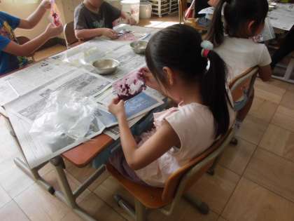 あさがおでいろみず遊びをしました。とてもきれいなむらさき色のいろみずができました。和紙に絵を描いたり、半紙で染めたりして楽しみました。