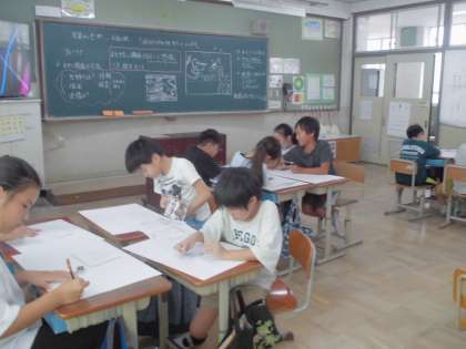 図工は「お話の絵」に取り組んでいます。1組は「チイの花たば」2組は「ぼくはアフリカにすむキリンといいます」というお話です。物語を聞いて、描きたい場面を想像し下描きを始めました。表現したい中心を大きく描くことを心がけて楽しく描き始めました。