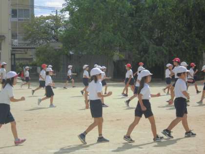 団体演技の練習が進んでいます。体育館での練習から運動場に出て全体を通しての練習や隊形移動の練習を頑張っています。