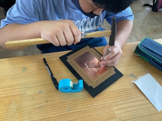 自分でデザインした下絵を板にうつし、金槌で打ち込んでいます。1つ1つの小さい点を細かく打ち込んで線にします。強く打ち込んでしまうと穴が開いてしまうので、要注意です!