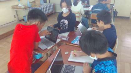 社会科の学習では,長篠の戦いの様子が描かれた長篠合戦図屏風を見て,気付いたことを交流しました。戦い方のちがいやどちらが強そうかなど,たくさん話し合っていました。