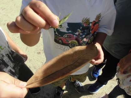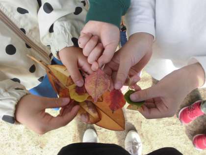 生活科の学習で「あき みつけ」をしました。少しづつ色が変わっている葉や木の実、バッタを見つけました。見つけたときには、みんなにこにこ笑顔でした。