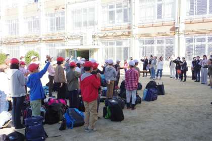 たくさんの保護者のみなさま、見送りを買って出た6年生たちに見守られ、元気に出発しました。お見送りいただきましたみなさま、ありがとうございました。