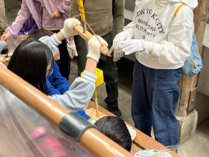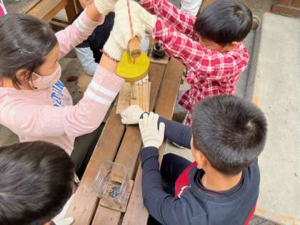 火おこし体験をします。道具を使って火をつけます。火を起こすにはコツがあり、すぐには点かず、頑張っています。