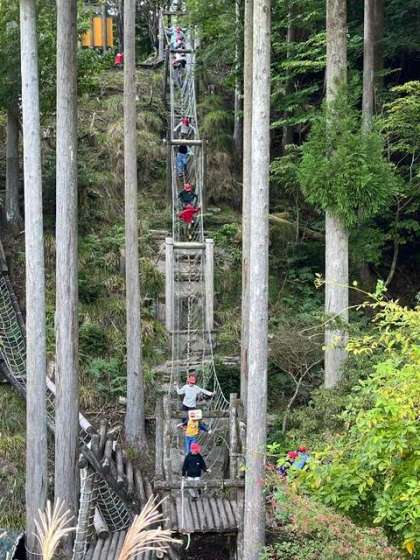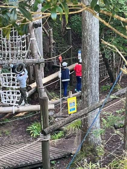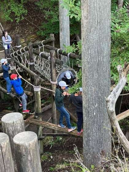 冒険の森に来ました。ロープ、丸太、山の斜面を生かして、登ったり、渡ったり自分の身体を自分で支えて進みます。時にはロープにぶら下がって進みます。