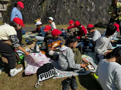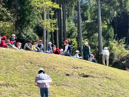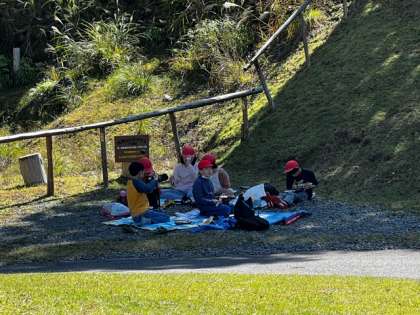 午前中のアクティビティであるフライングディスクゴルフが終わり、本館前の芝生で昼食のお弁当を食べました。さわやかな秋晴れが気持ちいいです。