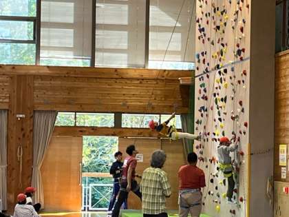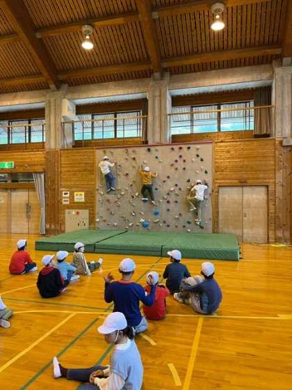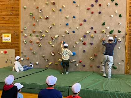 昼食後、午後のアクティビティはボルダリング。体育館の中に取り付けられた専用の壁面を、自分の手足で登っていきます。