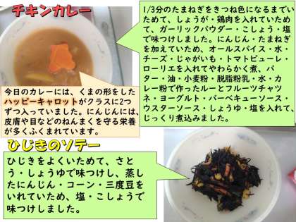 カレーは子どもたちに大人気です。今日は、鶏肉を使ったチキンカレーでした。給食のカレーやシチューは小麦粉やバター、脱脂粉乳などを使って、ルーから給食室で作ります。たまねぎの1/3分の量を先にきつね色のなるまでいためてから、しょうが・鶏肉・にんじん・残りの2/3分のたまねぎを入れていためて、水・チーズ・じゃがいも・トマトピューレなどを入れてやわらかく煮て、ルーとフルーツチャツネ・ヨーグルト・バーベキューソース・ウスターソース・しょうゆ・塩を入れてじっくりと煮込みました。ガーリックパウダーやオールスパイスなども味つけに使っています。今日は、クラスに2個ずつかわいいくまの形に型抜きしたにんじん、ハッピーキャロットが入っていました。子どもたちは食べ始めてすぐ探し始め、見つけて喜んでいました。周りの子たちも一緒に盛り上がっていました。