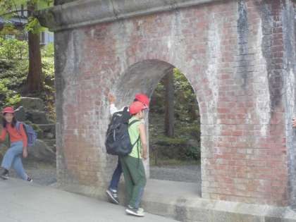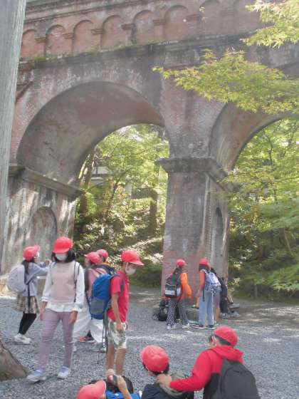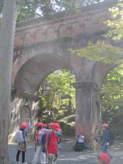 社会見学 南禅寺水路閣 公開日 2023/10/31 更新日 2023/10/31 4年担任から 疏水公園を後にして琵琶湖疏水沿いに歩き南禅寺の水路閣を見学しました。水路閣の上を実際に疏水の水が流れていることに驚いていました。間近で見るととても大きく、アーチが美しかったです。1日好天に恵まれ、充実した社会見学となりました。