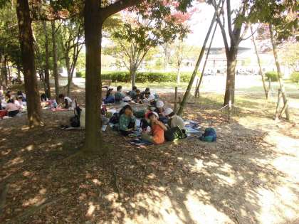 公園で遊んだ後、お弁当を食べました。お家の人の愛情がこもったおいしいお弁当を、にこにこ笑顔で食べていました。