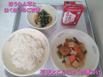 今日の献立は、「麦ごはん・牛乳・平天とこんにゃくの煮つけ・ほうれん草とはくさいのごま煮」でした。
