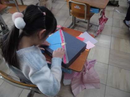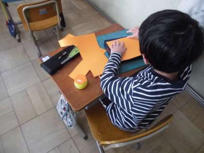 空き箱に折り紙や色画用紙、紙テープなどを使って飾りつけをしました。画用紙を箱の大きさに切り、貼り合わせたり、折り紙で折ったのを飾ったりしていました。思い思いの飾りつけを楽しんで取り組んでいました。