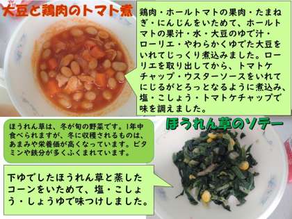 大豆と鶏肉のトマト煮は、鶏肉・ホールトマトの果肉・たまねぎ・にんじんをいためて、ホールトマトの果汁・水・大豆のゆで汁・ローリエでやわらかく煮て、さらに、やわらかくゆでた大豆をいれてじっくり煮込みました。ローリエを取り出してから、トマトケチャップ・ウスターソースをいれて煮汁がとろっとなるくらいまで煮込み、塩・こしょう・トマトケチャップで味を調えています。とろっとしたトマトソースが大豆や肉・野菜にからんでいます。パンにもよく合います。パンに残ったソースをつけて食べている子もいました。