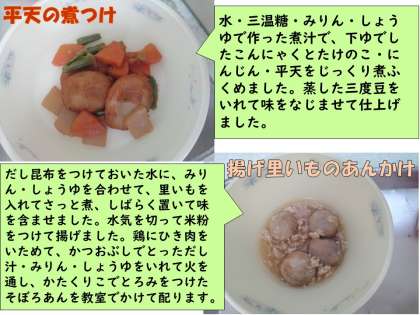 揚げ里いものあんかけは、だし昆布・みりん・しょうゆでさっと煮て味を含ませた里いもに米粉をつけて油で揚げました。鶏ひき肉をいためて、かつおぶしでとっただし汁・みりん・しょうゆを入れて、かたくり粉でとろみをつけたそぼろあんを教室で盛り付ける時に上からかけます。味のしみた里いもにかつおぶしと鶏肉のうまみのきいたそぼろあんがからんでこちらもごはんによく合います。「あんがごはんに合う。」「里いもがほくほくでおいしい。」「いつもの里いもと違う。」と大好評でした。