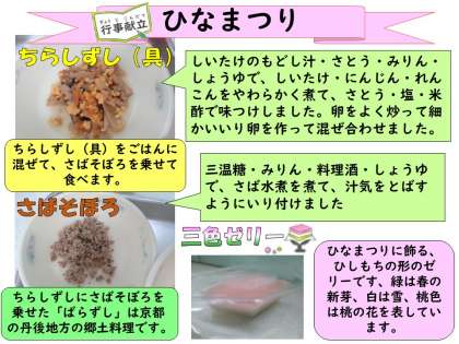 今日は、当日が日曜なので、少し早めにひなまつりの行事献立でした。献立は、「ごはん・牛乳・ちらしずし(具)・さばそぼろ・すまし汁・三色ゼリー」です。