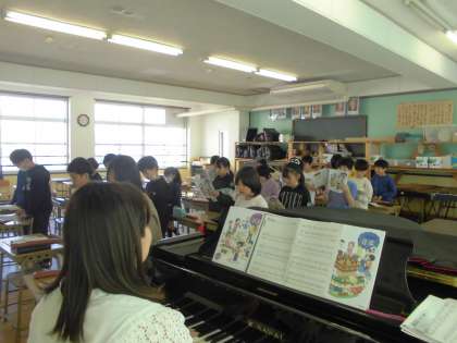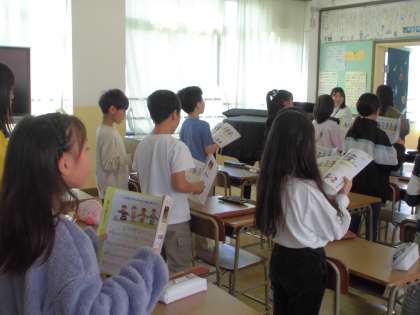 今年度は音楽を三谷先生に教えていただきます。今日は三谷先生の自己紹介や得意なオペラを披露していただきました。その後でみんなで元気に「小さな世界」を歌いました。音楽の記号についても教えていただきました。