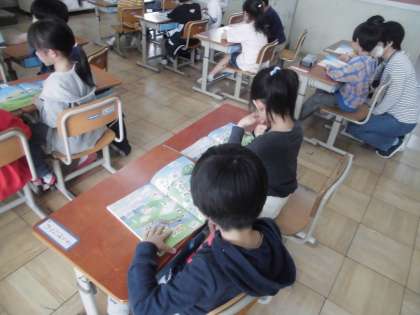 国語の学習では、「はるがきた」の絵を見て、何があるか、何をしているか、考えました。お隣の席のお友達と仲良く話しました。