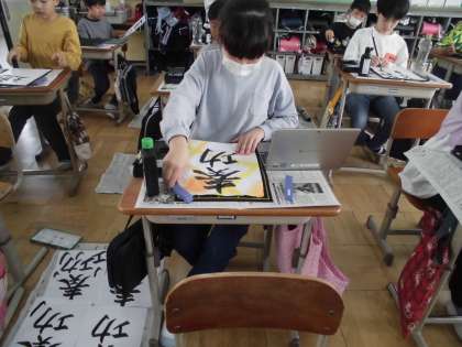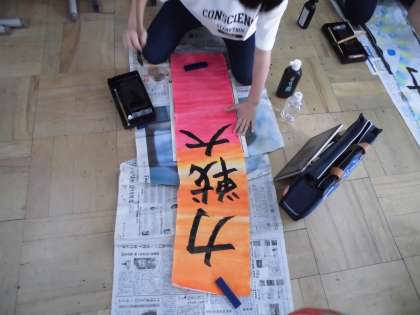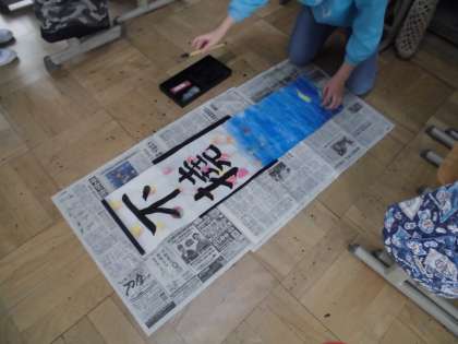 先日色付けを行った半紙に、毛筆で文字を書きました。みんなの想いの込められた字はとても迫力があってカッコイイです!