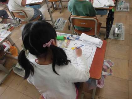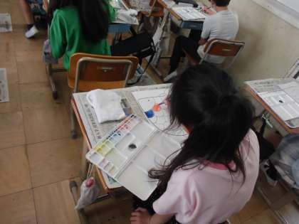 絵の具を使って魚のうろこの色をぬりました。絵の具を少しずつ水で薄めていきぬりました。色とりどりの魚が完成しました。教室の後ろに掲示します。