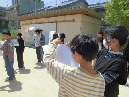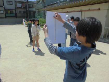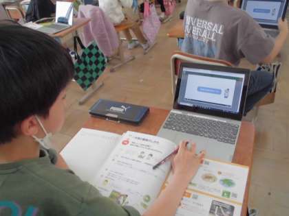理科の時間は、温度計の使い方を学習しました。教科書のQRコードを読み取って、温度計の使い方のポイントを学習してから実際に運動場で気温や水温を計る練習をしました。