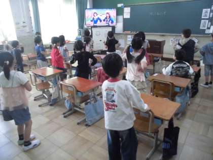 朝の時間に、ダンスを踊っています。朝から元気いっぱいです!