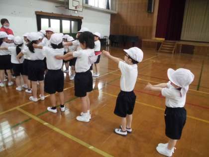 交流学年である1年2組と一緒に「からだほぐし」の学習をしました。まず初めに並び方の練習をしました。まっすぐに並ぶためにはどんなふうにしたらいいか考えながら並んでいました。
