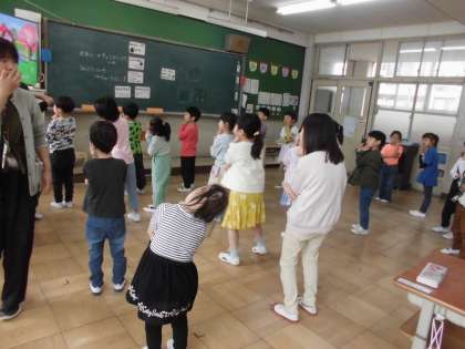 今日は1年2組の友達と一緒に先生の読み聞かせを聴いて、歌って踊りました。読み聞かせは「いいから いいから」と「もったいないばあさん」でした。「ドキドキドンいちねんせい」や「ジャンボリーミッキー」、「ポケモンダンス」を踊りました。校歌も練習しました。