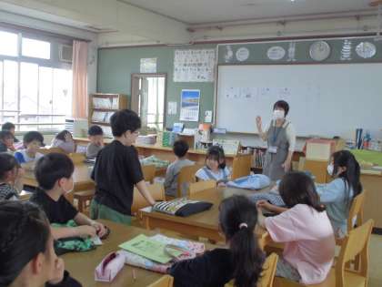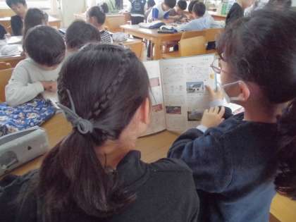 図書館司書の矢野先生と図書室の使い方や百科事典の使い方を学習しました。クイズに答えるために百科事典を引き、問題の答えを探していました。国語の教科書の35から37ページにある学習内容です。たくさん図書室を利用して本と友だちになり、図書館の達人になってほしいです。