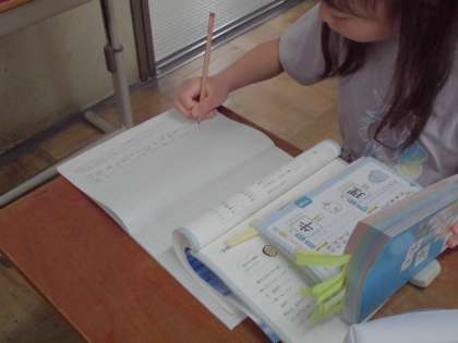 国語の学習で漢字辞典の使い方を学習しています。「部首引き」「音訓引き」「総画引き」の三つの引き方を学習して、実際に文中で使われている漢字の「読み」「意味」「使い方」などを調べました。